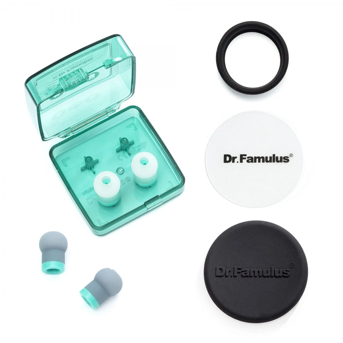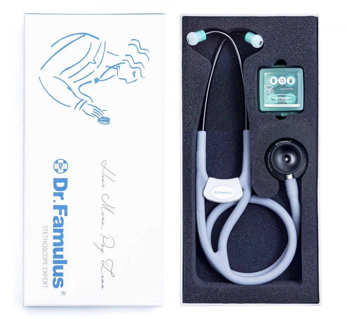 W każdym opakowaniu z stetoskopem Dr. Famulus znaleźć można dodatkowe dwie pary wymiennych oliwek (jedna para w większym rozmiarze/ jedna para w mniejszym rozmiarze) oraz pudełko do ich przechowywania. Do stetoskopu dołączona jest specjalnie zaprojektowana plakietka, nazwisko lekarza może być napisane na jej odwrocie. Innowacyjny przewód wykonany z silikonu jest miękki, gładki i sprężysty, przyjazny dla środowiska i super elastyczny. Stetoskop ma 86 cm długości i rozciąga się od 10 do 15 %. Silikon z którego jest zbudowany nie lepi się, nie marszczy i nie pęka nawet przy intensywnym użytkowaniu. Głowica stetoskopu Dr. Famulus jest wykonana z złoconego stopu miedzi i aluminium. Złoto posiada wysoką odporność na utlenianie i korozję, jest szeroko stosowane w urządzeniach które mają służyć przez lata.