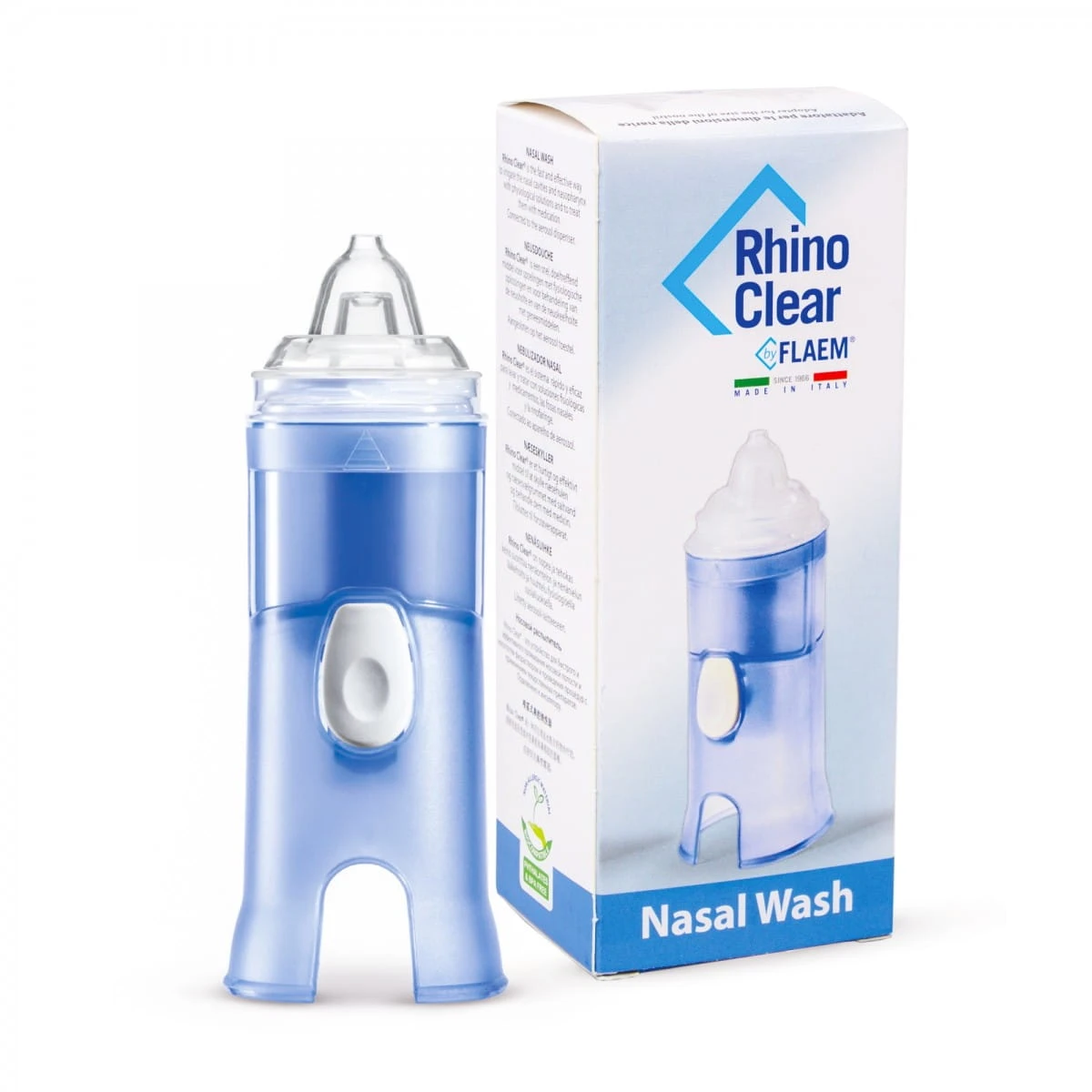 Irygator do oczyszczania zatok FLAEM NUOVA Rhino Clear to łatwe w użyciu i efektywne urządzenie rozpylające, przydatne w leczeniu zatok przynosowych i górnych partii dróg oddechowych. Aparat stosowany jest przy nieżycie nosa, przeziębieniach, alergiach i katarze. Może być stosowany z roztworami solnymi, wodami termalnymi lub lekami powszechnie dostępnymi w aptekach. Wytwarza strumień rozpylonych cząstek płynu płuczącego o stosunkowo dużej średnicy (prawie 50% cząsteczek między 10 a 50 mikro m) i dużej wydajności (5 ml/min.), które po wejściu do jam nosowych i gardła, nawadniają, zmiękczają i usuwają śluz, dzięki ciśnieniu, jakie wywierają na błony śluzowe. Wszystkie szkodliwe substancje spływają do specjalnej komory.