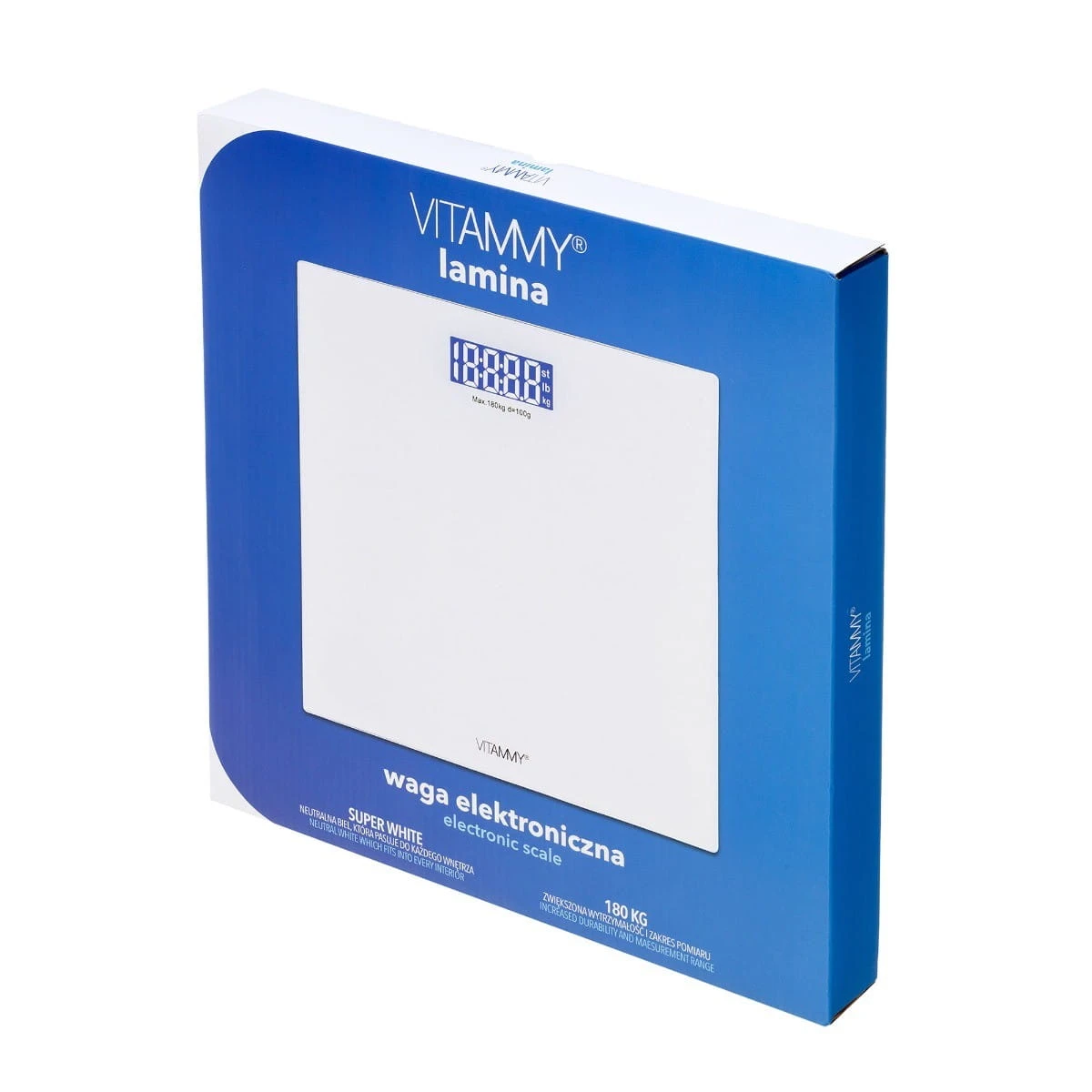 VITAMMY Lamina to precyzyjna, doskonale zaprojektowana i wykonana elektroniczna waga łazienkowa o ponadczasowym wyglądzie. Śnieżnobiała szklana tafla z dużym wyświetlaczem idealnie wpasuje się do wnętrza każdej łazienki uatrakcyjniając je i wzbogacając.